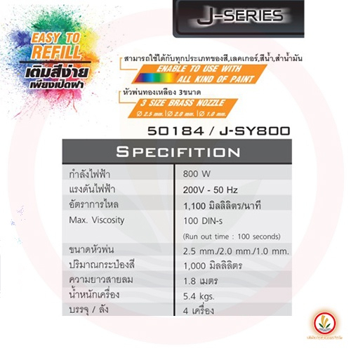 ข้อมูลทางเทคนิค กำลังไฟฟ้า : 800 W อัตราการไหล : 1,100 มิลลิลิตร/นาที Max. Viscosity : 100 DIN-s (Run out time : 100 Sec) ขนาดหัวพ่น : 2.5 mm. / 2.0 mm. / 1.0 mm. ปริมาณกระป๋องสี : 1,000 มิลลิลิตร ความยาวสายลม : 2 เมตร สามารถเติมสีได้โดยไม่ต้องหมุนถอดกระป๋องสีออกจากปืนพ่น