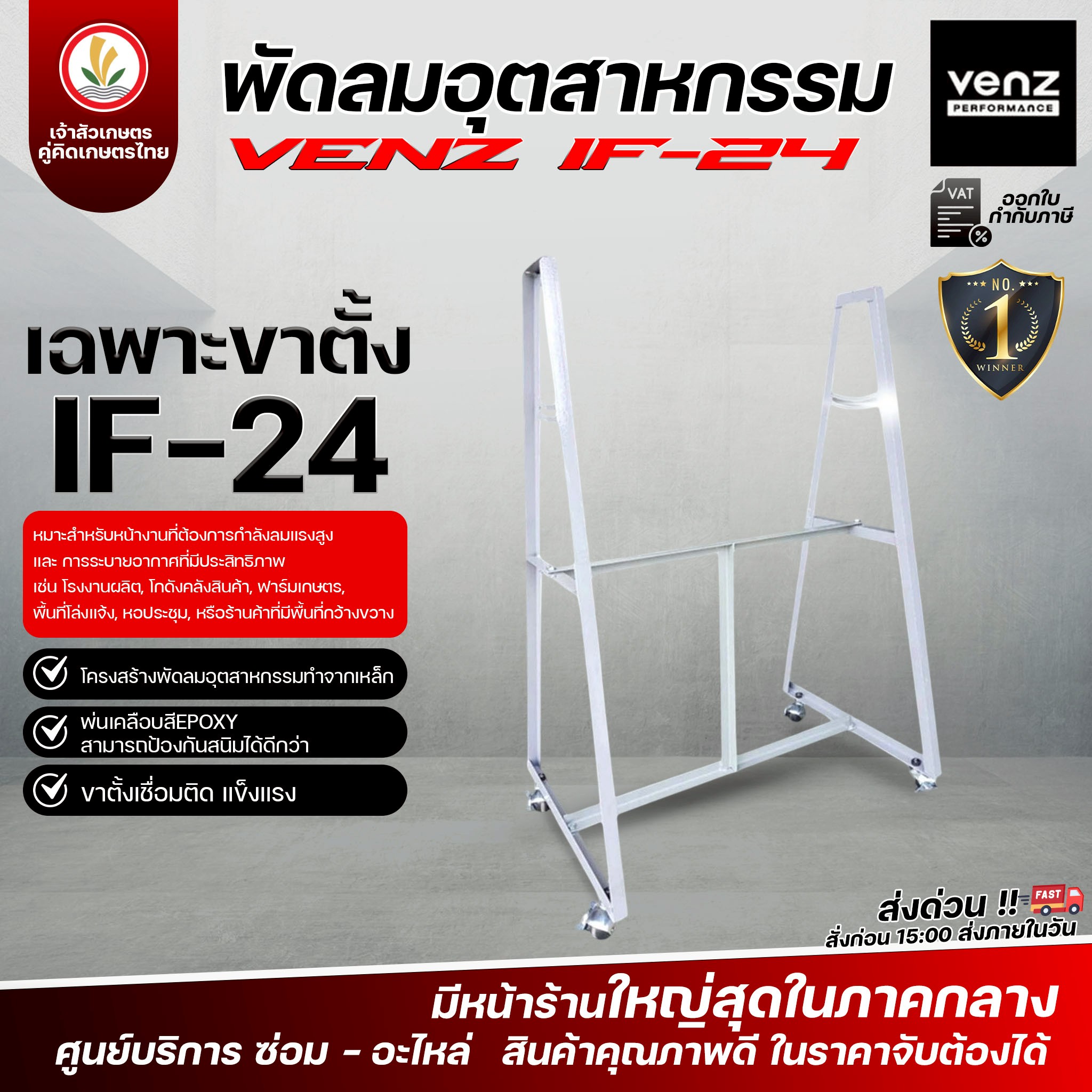 VENZ พัดลมอุตสาหกรรม พร้อมตะแกรง ขนาด 24 นิ้ว รุ่น IF-24 มอเตอร์คาปาซิเตอร์รันนิ่ง ประหยัดไฟ ใบพัดทำจากอลูมิเนียม พ่นสีเคลือบ ตะแกรงถี่ช่วยให้ปลอดภัยมากขึ้น ขนาดมอเตอร์ : 1/2 HP. 220 V ขนาดใบพัด : 24 นิ้ว ปริมาณลม : 212/7500 (cmm/cfm) ทำความสะอาดบริเวณใบพัด และตะแกรงครอบใบพัดไม่ให้มีฝุ่นเกาะ ควรทำความสะอาดช่องระบายอากาศตรงฝาครอบมอเตอร์พัดลมบ่อยครั้ง เพราะเป็นช่องระบายความร้อน ควรติดตั้งพัดลมในบริเวณที่มีพื้นผิวเรียบ และไม่มีน้ำขัง เมื่อเลิกใช้งาน ควรถอดปลั๊กออก และเก็บสายไฟให้เรียบร้อย โครงสร้างทำจากเหล็กพ่นเคลือบสี EPOXY ใบพัดทำจากอลูมิเนียมพร้อมพ่นสี ขนาดมอเตอร์ 1/2 HP. 220 V ปริมาณลม(cmm / cfm) 212 / 7500 รอบมอเตอร์ 1450 RPM