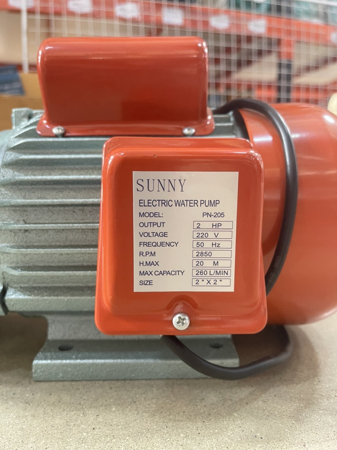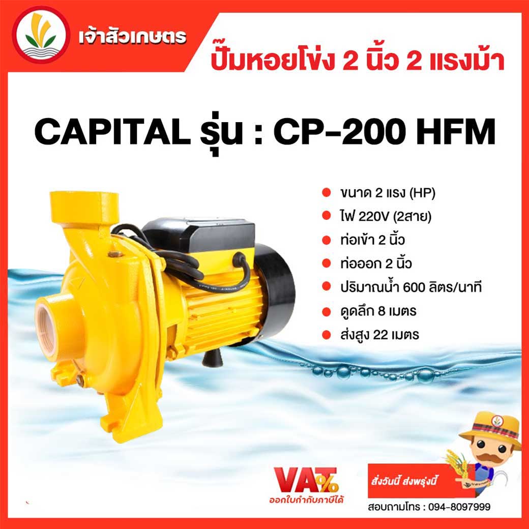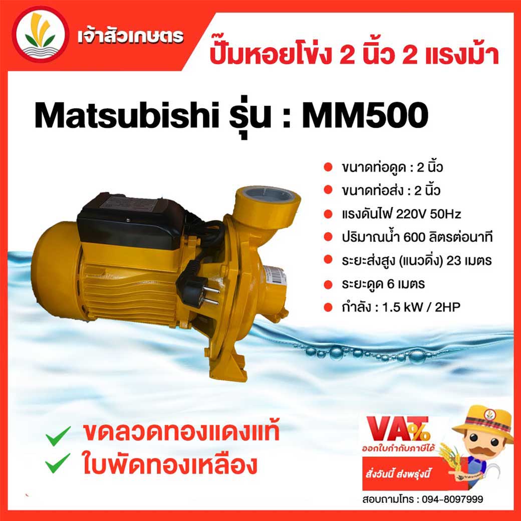 ปั๊มหอยโข่ง SUNNY ขนาดท่อ 2" x 2" - ดูดลึก 9 m. - กำลัง 2.0 Hp - ปริมาณน้ำ 260 l/min - แรงส่งสูง 20 m. - ความเร็วรอบ 2850 rpm ---------------------------------------------- ปั๊มหอยโข่ง 2 แรง ท่อน้ำออก 2 นิ้ว CAPITAL รุ่น : CP-200 HFM - ขนาด 2 แรง (HP) - ไฟ 220V (2สาย) - ท่อเข้า 2 นิ้ว - ท่อออก 2 นิ้ว - ปริมาณน้ำ 600 ลิตร/นาที - ดูดลึก 8 เมตร - ส่งสูง 22 เมตร ------------------------------------------ ปั๊มหอยโข่ง 2 นิ้ว 2 แรงม้า Matsubishi รุ่น : MM500 ** ขดลวดทองแดงแท้ ** ใบพัดทองเหลือง ขนาดท่อดูด : 2 นิ้ว ขนาดท่อส่ง : 2 นิ้ว แรงดันไฟ 220V 50Hz ปริมาณน้ำ 600 ลิตรต่อนาที ระยะส่งสูง (แนวดิ่ง) 23 เมตร ระยะดูด 6 เมตร กำลัง : 1.5 kW / 2HP