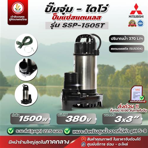 ปั๊มแช่/ไดโว่ MITSUBISHI รุ่น SSP-1505T ดูดน้ำแสตนเลส 3นิ้ว Auto SSP-1505ta (มีลูกลอย)1500W 380V 2HP 3สาย