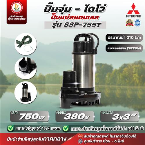 ไดโว่ ปั๊มแช่ MITSUBISHI รุ่น SSP-755T, SSP-755TA (มีลูกลอย) 750 วัตต์ 1HP ท่อออก 3 นิ้ว ไฟ 380V ปั๊มแช่ รับประกัน 1 ปี