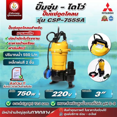 MITSUBISHI รุ่น CSP-755S , CSP-755SA ปั๊มแช่ ดูดโคลน ขนาด 3 นิ้ว (750 วัตต์ / 1แรง) ปั๊มจุ่มดูดโคลน ประกัน12เดือน
