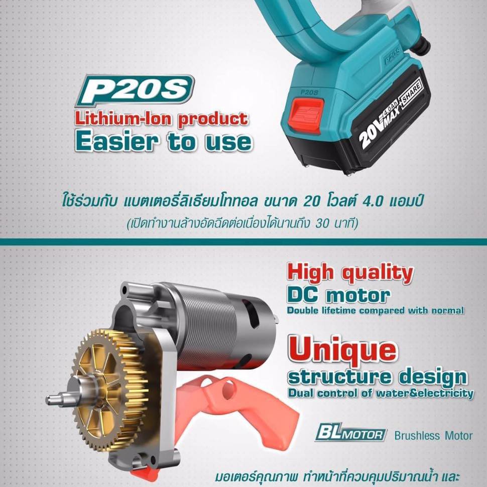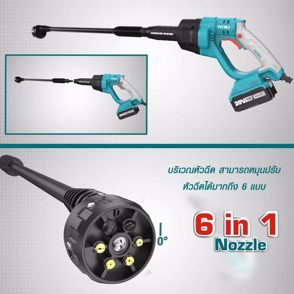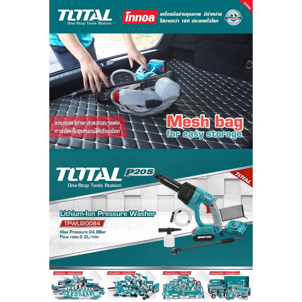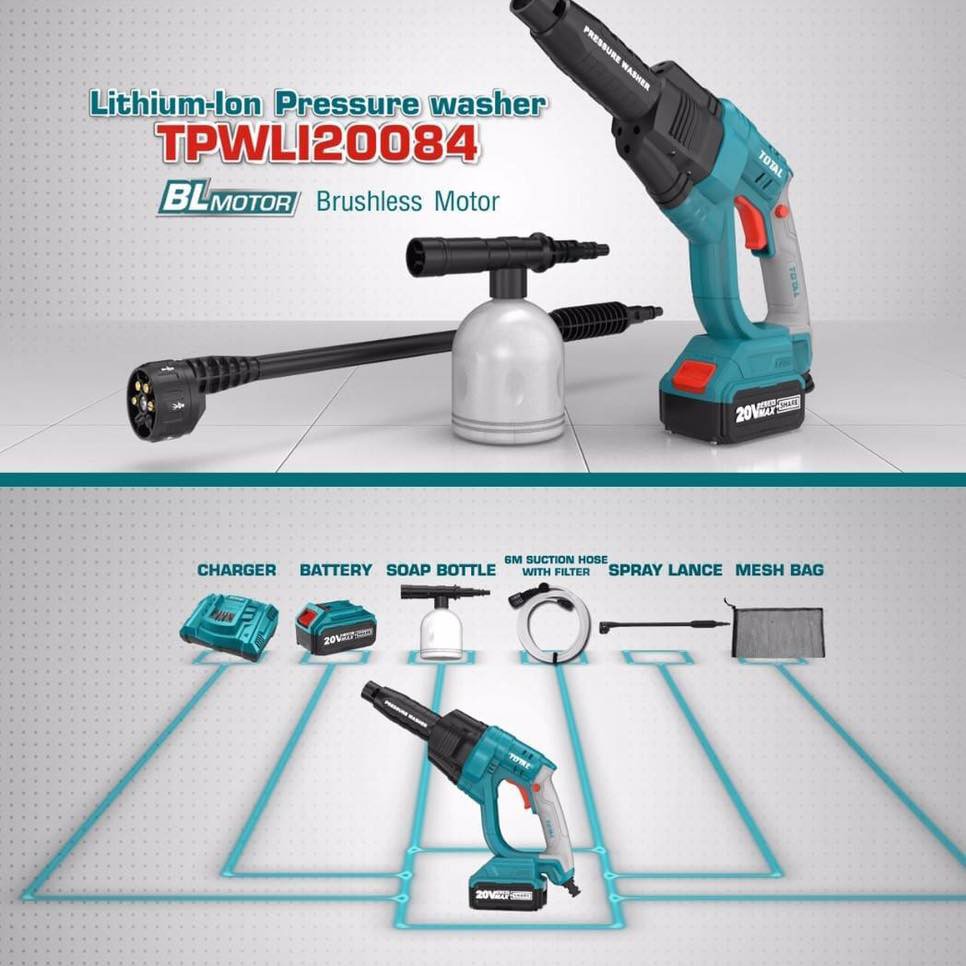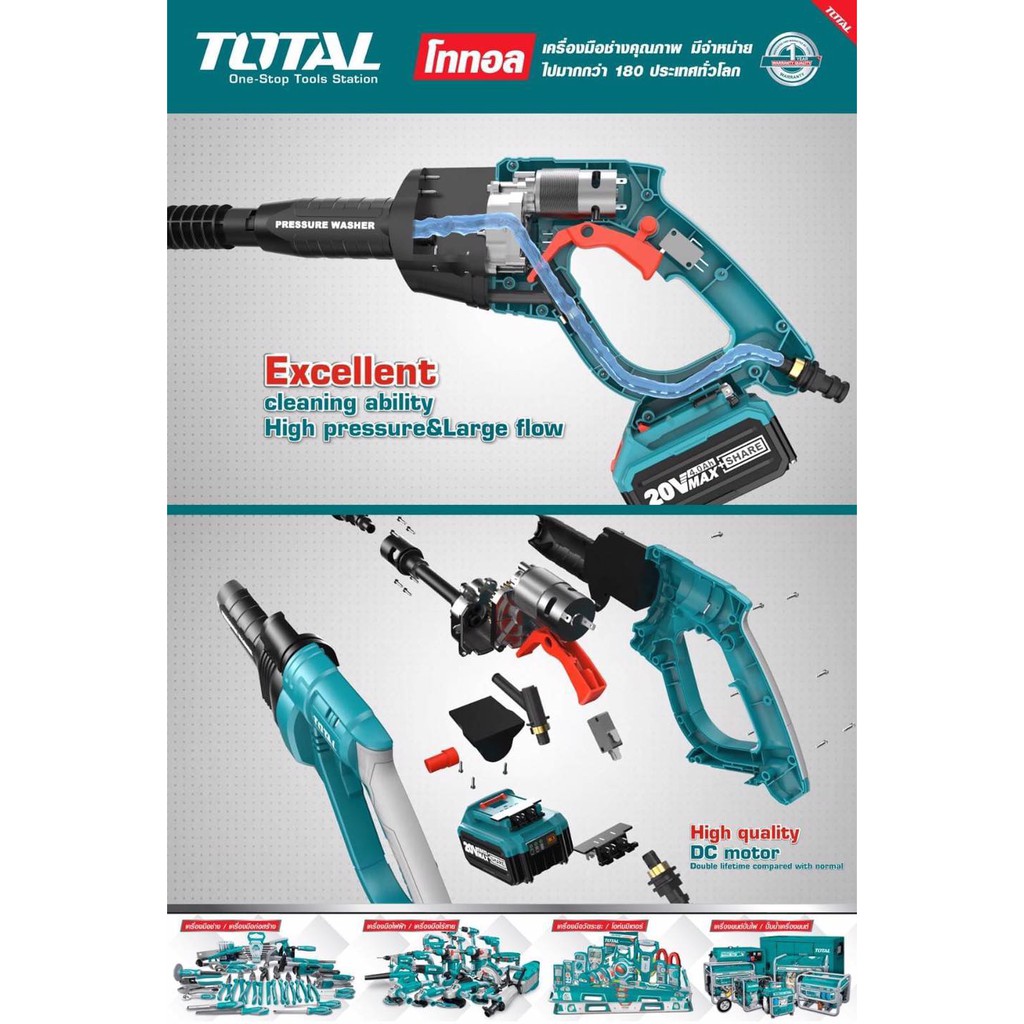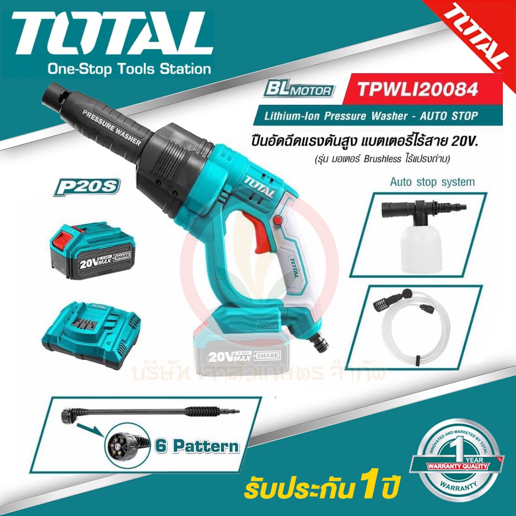 ปืนอัดฉีดแรงดันสูง แบตเตอรี่ไร้สาย 20V. (รุ่น มอเตอร์ Brushless ไร้แปรงถ่าน) TOTAL Pressure washer รุ่น TPWLI20084 Lithium-Ion Pressure Washer - AUTO STOP พร้อมแบตเตอร์รี่ 4แอมป์ 1 ก้อน และ แท่นชาร์จ 1 อัน