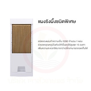 Anion ปล่อยประจุลบ ช่วยกำจัดฝุ่น เชื้อราในอากาศ นอกจากนั้นด้วยคุณสมบัติของที่เป็นประจุไฟฟ้าของ Anion ยังสามารถฆ่าเชื้อโรค และแบคทีเรีย บางชนิดได้ด้วย -เล็ก เย็น กระทัดรัด ครอบคุมพื้นที่ 10 ตร.ม. -ปรับระดับแรงลมได้ 3 ระดับ -มีใบพัดพิเศษช่วยส่งลมได้ไกล ให้ปริมาณลมสูง ใช้งานง่ายด้วยระบบควบคุมแบบปุ่มกด -ปริมาณลม 760 ลบ.ม./ชม. -ความจุถังน้ำ 9.3 ลิตร -น้ำหนักเครื่อง 5.5 กก. และเมื่อเติมน้ำจะมีน้ำหนักอยู่ที่ 14.8 กก. -ใช้งานต่อเนื่อง 10 – 13 ชม. -อัตราการใช้น้ำ 0.7 – 0.9 ลิตร/ชม. -กำลังไฟฟ้า 45 วัตต์ -กระแสไฟฟ้า 0.2 แอมป์ -แหล่งจ่ายไฟฟ้า 220 V/50 Hz -มีช่องจ่ายลมขนาด 21.5 x 25 ซม. ให้ปริมาณลมถึง 760 ลบ.ม./ชม. -ตัวเครื่องขนาด 28x25x75 ซม. -แข็งแรงทนทานด้วยวัสดุ ABS -ล้อเข็นเคลื่อนที่ได้ -มีช่องเติมน้ำด้านหลัง แบบลิ้นชักสามารถใช้งานได้ง่าย -แผงรังผึ้งชนิดพิเศษ ชนิดของแผ่นทำความเย็น 5090 จำนวน 1 แผ่น -เพิ่มความสะดวกได้มากกว่าปลั๊กสามารถถอดเก็บได้