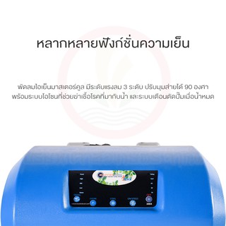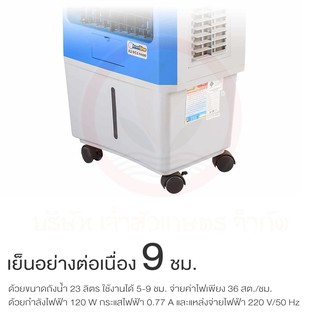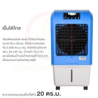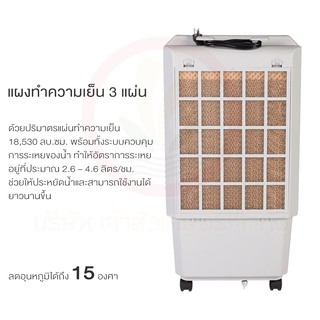 รายละเอียดสินค้า - ปริมาณลม 2,000 m3/hr - ปริมาตรแผ่นทำความเย็น 18,530 ลบ.ซม. - ขนาด 34 x 48 x 87 ซม. - ขนาดช่องลม 35x35 ซม. - ขนาดใบพัด 13 นิ้ว - ครอบคลุมพื้นที่ 20 ตารางเมตร - อัตราการใช้ไฟเพียง 42 สตางค์/ชั่วโมง - กำลังไฟฟ้า 120 วัตต์ - แหล่งจ่ายไฟฟ้า 220 v/50Hz - เติมน้ำ 23 ลิตร ใช้งานต่อเนื่อง 5 - 9 ชั่วโมง - น้ำหนักสุทธิ(ก่อนเติมน้ำ) 10.5 กิโลกรัม - น้ำหนักขณะทำงาน 33.5 กิโลกรัม - อัตราการใช้น้ำ 2.6 - 4.6 ลิตร/ชั่วโมง - ระดับเสียง 52 เดซิเบล - ลดอุณหภูมิได้สูงสุดถึง 15 องศา - มีรีโมทคอนโทรลและตั้งเวลาปิดอัตโนมัติ - พร้อมระบบโอโซนฆ่าเชื่อโรคในน้ำ - ระบบเตือนและตัดปั้มเมื่อน้ำหมด