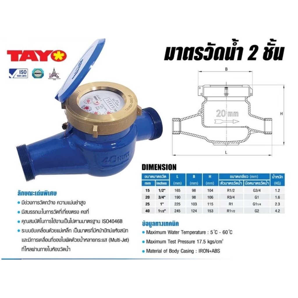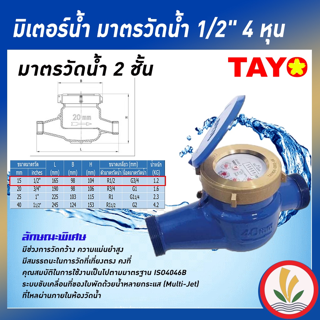 มิเตอร์น้ำ/มาตรวัดน้ำ ระบบเฟือง 2 ชั้น Tayo ขนาด 1/2" (4หุน) (มีใบรับรองช่วงตวงวัด)
