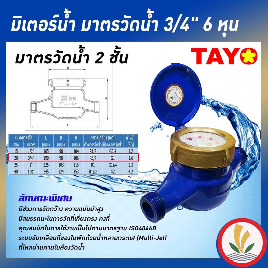 มิเตอร์น้ำ/มาตรวัดน้ำ ระบบเฟือง 2 ชั้น Tayo 3/4" (6หุน) (มีใบรับรองช่างตวงวัด)