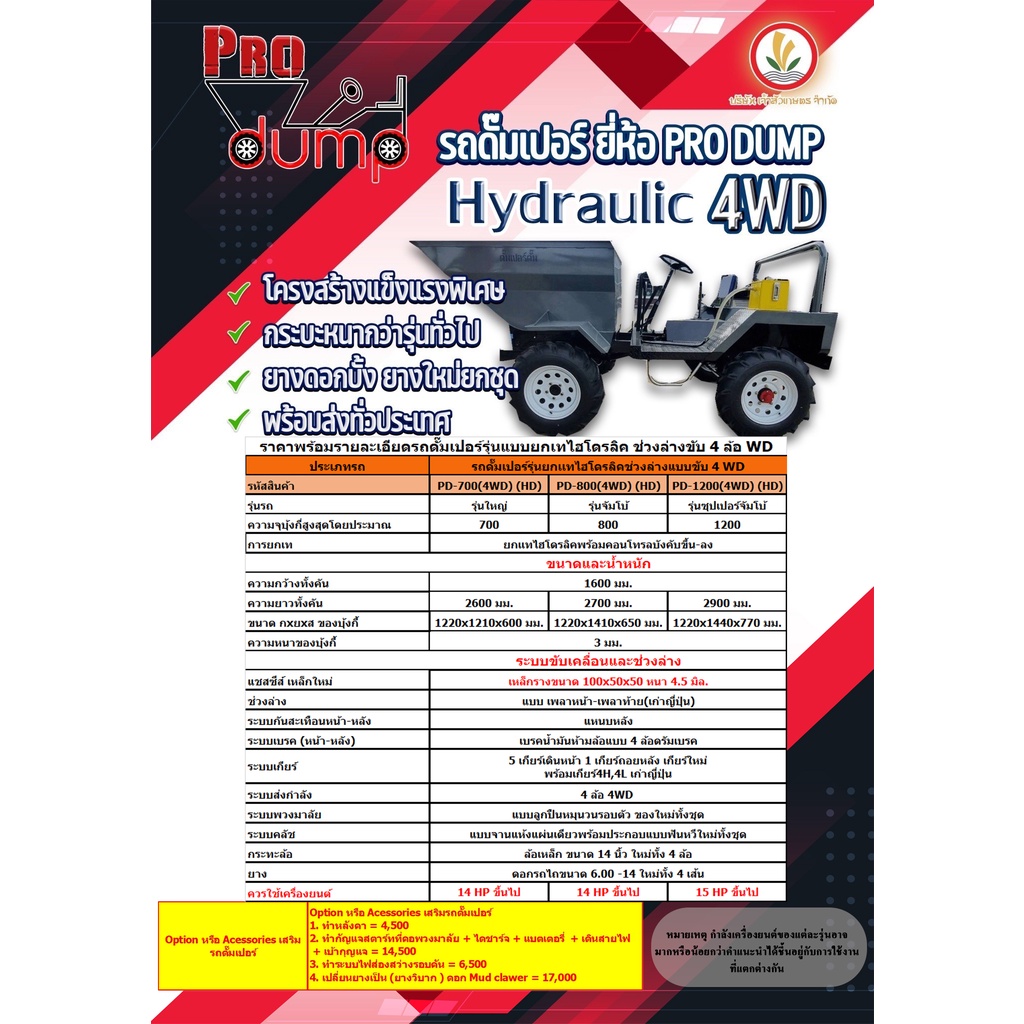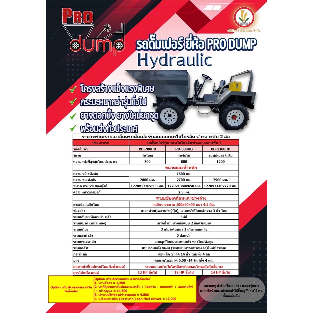 รถดั๊มเปอร์ Pro Dump Hydraulic ราคาไม่รวมเครื่องยนต์ มีให้เลือก ตั่งแต่ 700 800 1200 ลิตร และมีทั้ง ระบบ ขับเคลื่อ 2 ล้อ และ 4 ล้อ ระบบเกียร์ 4 เกียร์ โครงสร้างแข็งแรงพิเศษ กระบะหนากว่ารุ่นทั่วไปในท้องตลาด ยางดอกบั้งใหม่ ทั้งชุด มีบริการจัดส่งทั่วประเทศ