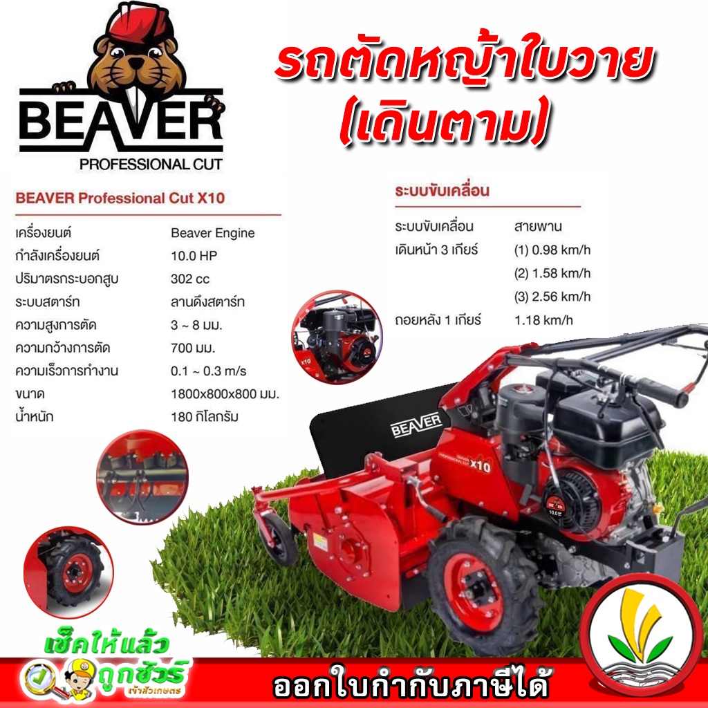รุ่น BEAVER-CUT-X10 เครื่องยนต์ Beaver Engine กำลังเครื่องยนต์ 10 แรงม้า ปริมาตรกระบอกสูบ 302 ซีซี ระบบสตาร์ท ลานดึงสตาร์ท ความสูงการตัด 3~8 มม. ความกว้างการตัด 700 มม. ความเร็วการทำงาน 0.1~ 0.3 m/s ขนาด 1800x800x800 มม. น้ำหนัก 180 กิโลกรัม ระบบขับเคลื่อน สายพาน เดินหน้า 3 เกียร์ (1) 0.98 Km/h (2) 1.58 Km/h (3) 2.56 Km/h ถอยหลัง 1 เกียร์ 1.18 Km/h
