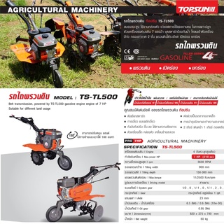 รถไถพรวนดิน TOPSUN รุ่น TS-TL500 รถไถพรวนดินอเนกประสงค์ ท๊อปซัน แข็งแรง สมรรถนะสูง ใช้งานคล่องตัว เป็นเครื่องทุ่นแรงในการทำงาน ด้วยประสิทธิภาพของเครื่องยนต์เบนซิน 7 แรงม้า ชุดสตาร์ทออกแบบพิเศษ ป้องกันน้ำและโคลน กรองอากาศแบบน้ำมัน 2 ชั้น