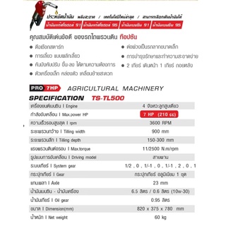 ข้อมูลทางเทคนิค เครื่องยนต์เบนซิน 4 จังหวะลูกสูบเดี่ยว กำลังเครื่องยนต์ 7 HP (210 cc) ความเร็วรอบ 3600 รอบ/นาที ระยะพรวนกว้าง 900 mm ระยะพรวนลึก 150-300 mm แรงพรวนดินต่อรอบ 11/2500 N.m/rpm ขับเคลื่อนด้วยระบบ สายพาน ระบบเกียร์ 1/2 , 0 1/1-1 , 0 , 1/1-1 , 2 , 0 , 1 กระปุกเกียร์ อลูมิเนียม 1 ชุด แกนเพลา 23 มม น้ำมันเบนซิน 6.5 ลิตร น้ำมันเครื่อง 0.6 ลิตร น้ำมันเกียร์ 0.95 ลิตร ขนาด 820 x 375 x 780 มม. น้ำหนัก 60 กิโลกรัม