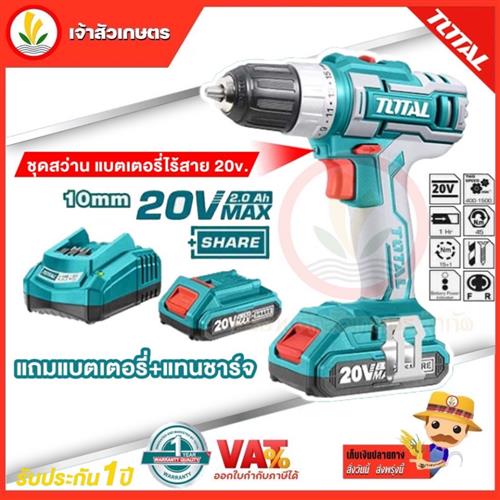 ชุดสว่านแบตเตอรี่ไร้สาย TOTAL 20v. (ปรับซ้ายขวาได้) รุ่น TDLI20021