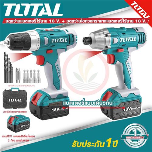 🔥 ชุดสุดคุ้ม🔥 TOTAL สว่านไร้สาย + ไขควงกระแทกไร้สาย 18 โวลท์ แถมฟรี!! แบตเตอรี่ลิเธียม Li-ion 2 ก้อน tckli18021