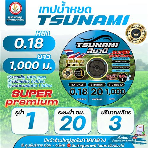เทปน้ำหยด สายน้ำหยด แบรนด์ TSUNAMI (รุ่นใหม่) ระยะห่าง ( 20 ซม ) 1รู 2รู หนา 0.16,0.18,0.20 ยาว 1000 เมตรเต็ม