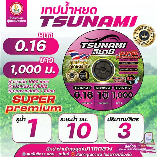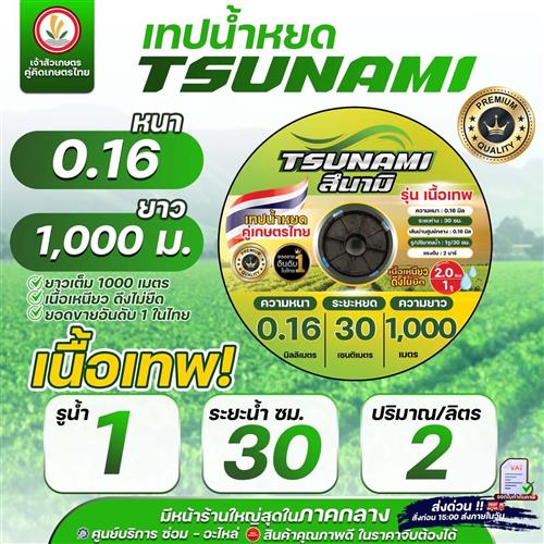 เทปน้ำหยด สายน้ำหยด แบรนด์ TSUNAMI (รุ่นใหม่) ระยะห่าง ( 30 ซม ) 1รู 2รู หนา 0.16,0.18,0.20 ยาว 1000 เมตรเต็ม