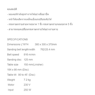 รายละเอียดสินค้า - มอเตอร์กำลังสูงทำงานได้อย่างมืออาชีพ - หน้าโต๊ะผลิตจากเหล็กแข็งแรงปรับระดับได้ - กระดาษทรายสายพานขนาด 1 นิ้ว กระดาษทรายกลมขนาด 5 นิ้ว - สามารถถอดเปลี่ยนกระดาษทรายได้ง่าย