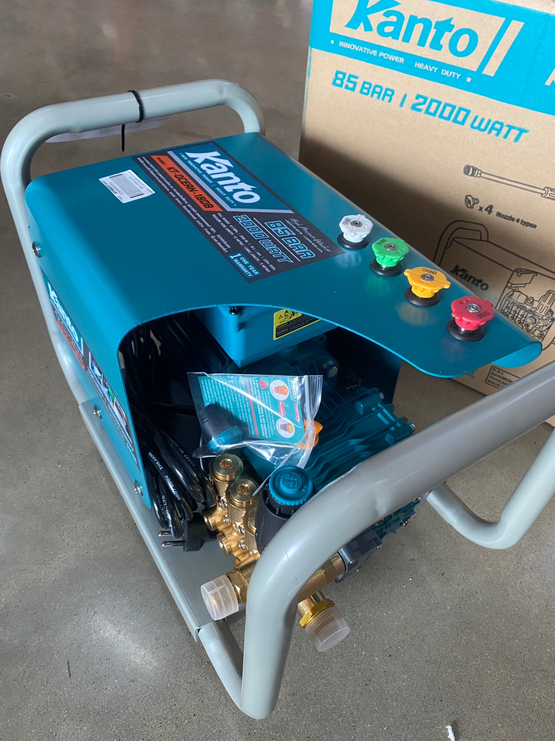 ข้อมูลตัวเครื่อง กำลังมอเตอร์ : 2000w แรงดันสูงสุด : 85 bar ปริมาณน้ำ : 10L/min ความเร็วมอเตอร์ : 2800 RPM โวลต์ความถี่ : 220V 50Hz ขนาด : 48 x 32 x 44.5 น้ำหนัก : 22 kg