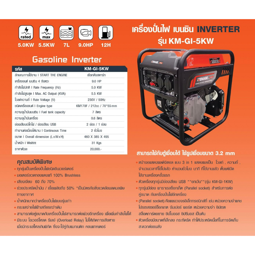 ลักษณะการใช้งาน | START THE ENGINE เชือกดึงสตาร์ท เครื่องยนต์ เบนซิน 4 จังหวะ 9.0 HP กำลังไฟปกติ I Rate Frequency (Hz) 5.0 KW กำลังไฟสูงสุด I Max. AC Output (KVA) 5.5 KW โวลต์ความถี่ I Rate Voltage (V 230V / 50Hz ชนิดเครื่องยนต์ I Engine type KM170F / 212cc / 70*55 mm ความจุน้ำมันเบนชิน 1 Fuel tank capacity 7 ลิตร ความจุน้ำมันเครื่อง 0.6 ลิตร ช่องเสียบปลั๊กไฟ / ช่องเสียบ USB 2 ช่อง / 1 ช่อง ทำงานต่อเนื่องได้นาน I Continuous Time 2 ชั่วโมง ขนาด I Overall dimension (LxWxH) 460 X 385 X 495 น้ำหนัก I Weihht 31 Kgs