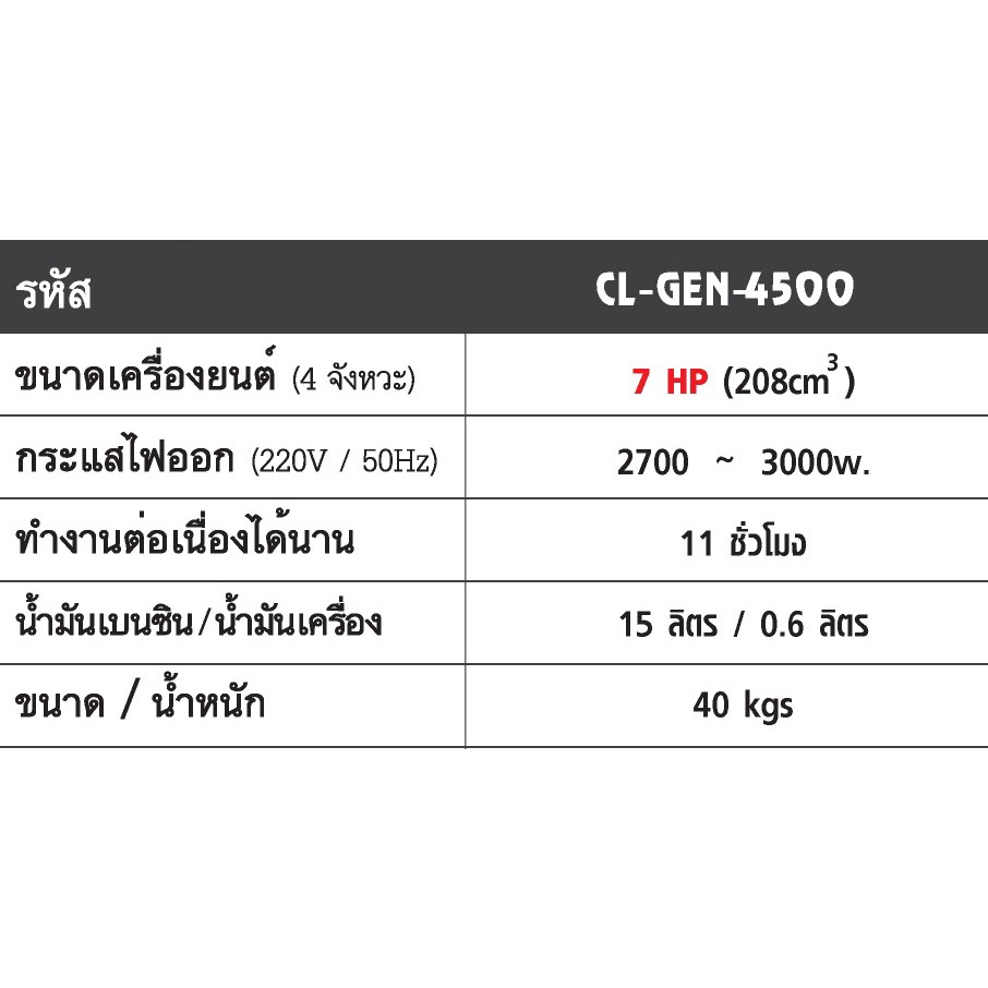 เต็มประสิทธิภาพ มีระบบป้องกันแรงสั่นสะเทือน เสียงไม่ดัง ลักษณะการใช่งาน มือดึง,สตาร์ทด้วยกุญแจ โครงสร้างทำจากโลหะแข็งพิเศษ ทนทาน ราคาถูก ขนาดเครื่องยนต์ : 7 HP (212cc) กระแสไฟออก(220v) : 2700-3000 w ทำงานต่อเนื่องนาน : 11 ชั่วโมง น้ำมันเบนซิน / น้ำมันเครื่อง : 15 ลิตร / 0.6 ลิตร สามารถใช้น้ำมันเบนซิน 91,95 และแก๊สโซฮอล์ 91,95 น้ำหนักรวม 40 kg.