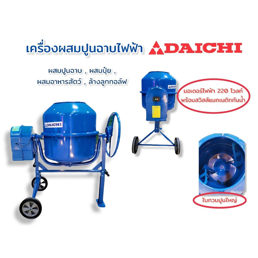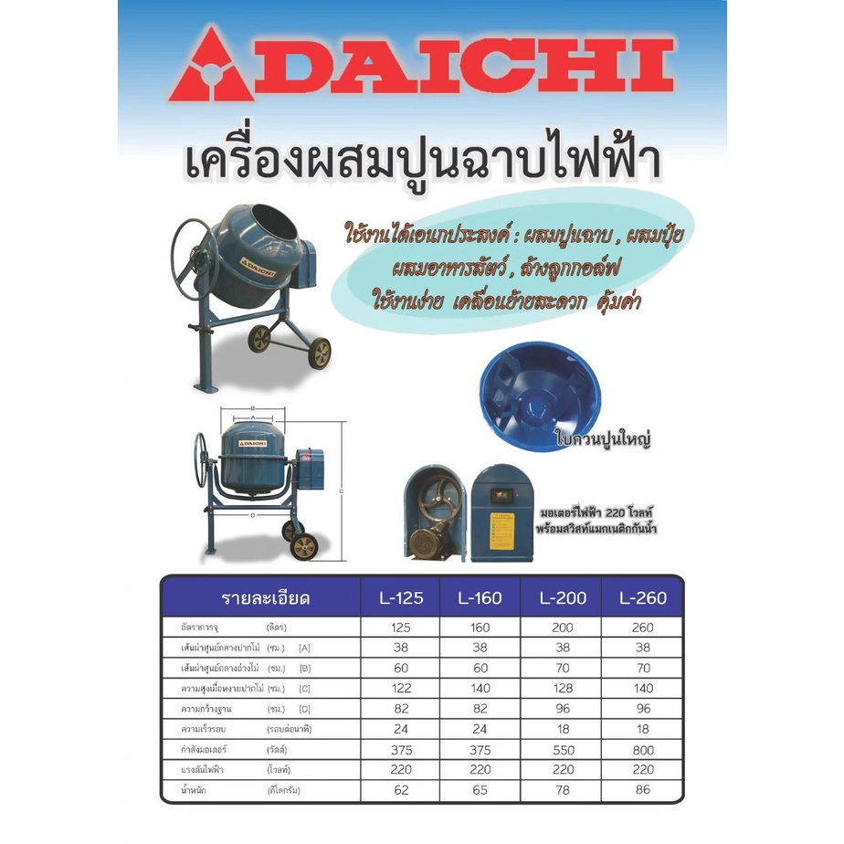 รายละเอียดสินค้า เครื่องผสมปูนฉาบ (DAICHI) ขนาด 160 ลิตร พร้อมมอเตอร์ไฟฟ้า 220 โวลท์ เครื่องผสมปูนฉาบ (DAICHI) ขนาด 160 ลิตร พร้อมมอเตอร์ไฟฟ้า 220 โวลท์ มอเตอร์ 375 วัตต์