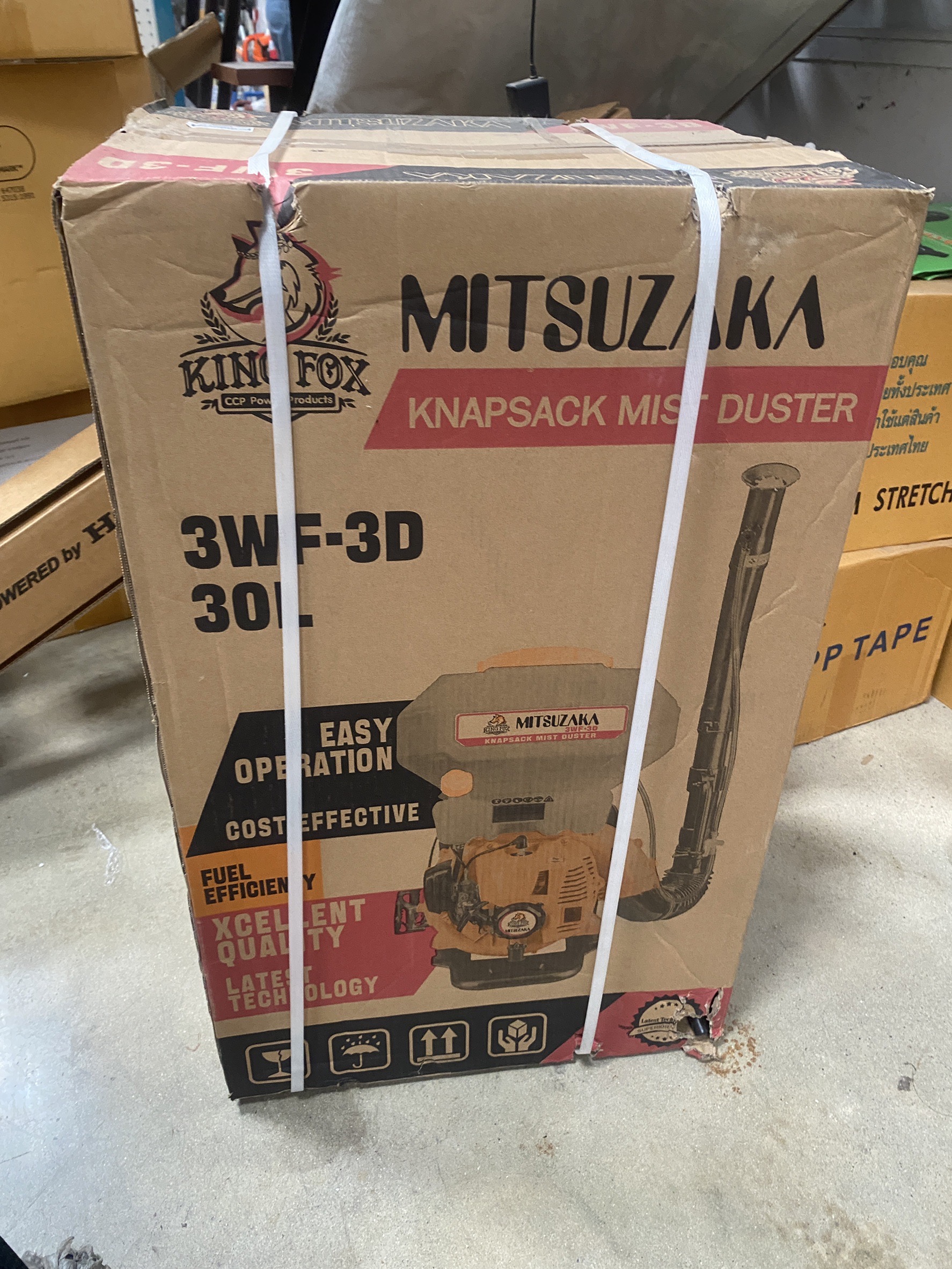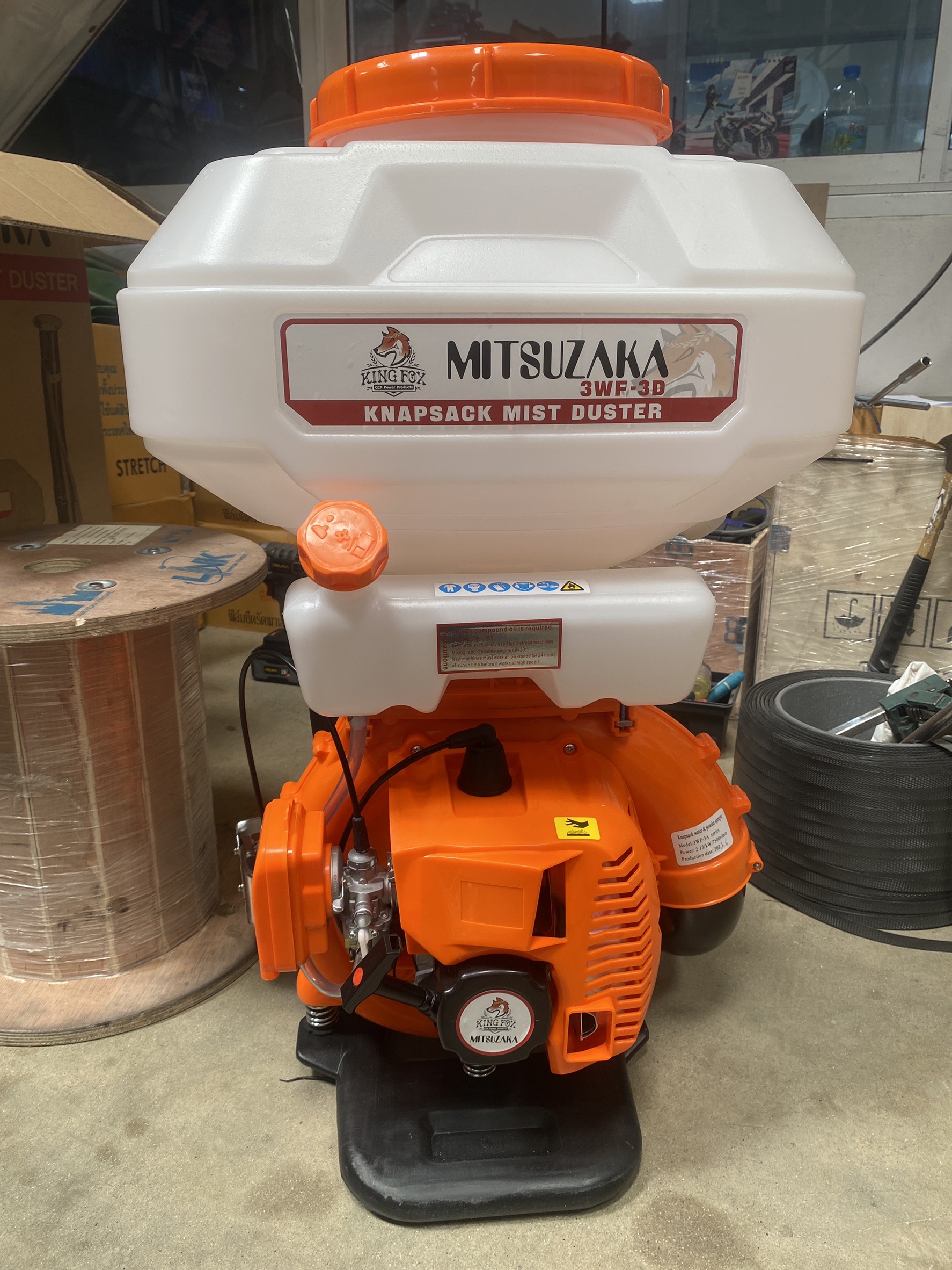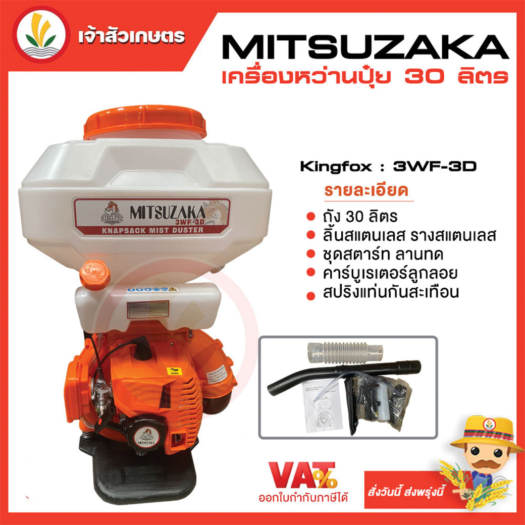 เครื่องพ่นปุ๋ย เครื่องหว่านปุ๋ย MITSUZAKA 30 ลิตร 30L รุ่น 3WF-3D ชุดสตาร์ทลานทด แข็งแรง ทนทาน ถัง 30 ลิตร ลิ้นสแตนเลส รางสแตนเลส ชุดสตาร์ท ลานทด คาร์บูเรเตอร์ลูกลอย สปริงแท่นกันสะเทือน น้ำหนัก 13 Kg.