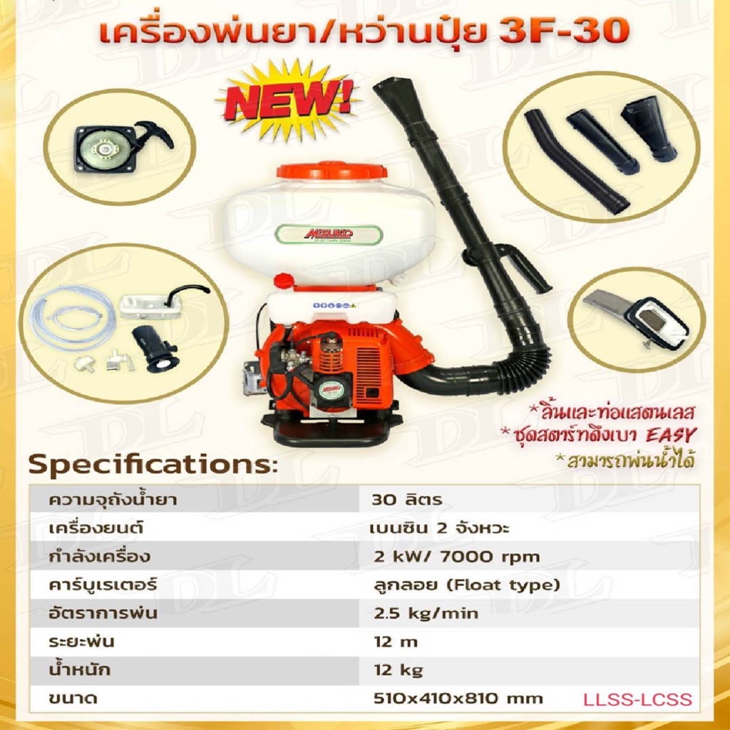 ความจุถังน้ำยส 30ลิตร เครื่องยนต์ เบนซิน 2 จังหวะ กำลังเครื่อง 2kw/7000rpm คาร์บูเรเตอร์ ลูกลอย / ผ้าปั๊ม (สามารถเลือกได้) อัตราการพ่น 2.5kg./min ระยะพ่น 12m น้ำหนัก 12kg. ขนาด 510x410x810 mm.