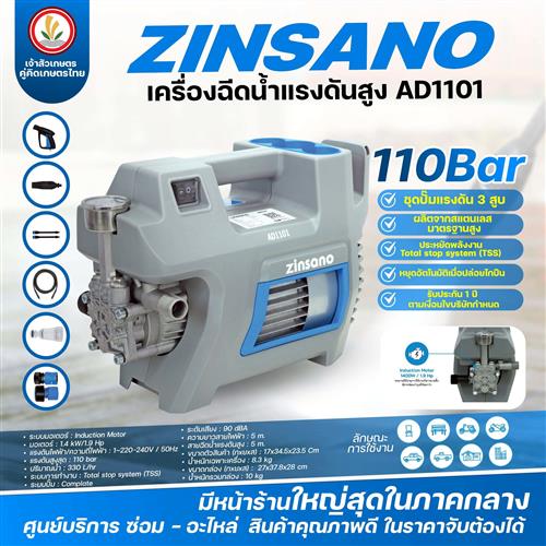 เครื่องฉีดน้ำแรงดันสูง 110 บาร์ Zinsano รุ่น AD1101 (Induction Motor) 1400W ซินซาโน่ ปั๊มแรงดัน 3 สูบ เครื่องฉีดน้ำ