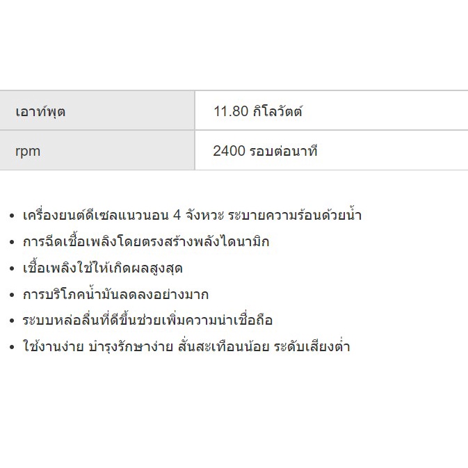 กำลังแรงม้าสูงสุด 16.0 แรงม้า /2400รอบ/นาที (11.77kw./2400rpm)