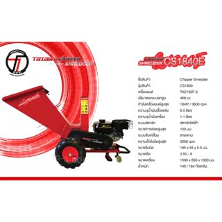 ✅รุ่น: Chipper Shredder ย่อยสูงสุดได้ 4 นิ้ว ✅รุ่นสินค้า: CS1840E ✅เครื่องยนต์: TAZ192F-2 (18 HP) ✅กำลังเครื่องยนต์: 9.8kW/3600rpm ✅ปริมาตรกระบอกสูบ: 459cc ✅ความจุน้ำมันเชื้อเพลิง: 6.5L. ✅ความจุน้ำมันเครื่อง: 1.1L. ✅ระบบสตาร์ท: สตาร์ทไฟฟ้า ✅ขนาดการย่อยสูงสุด: 100mm. ✅ระบบขับเคลื่อน: สายพาน ✅ความเร็วใบมีดสูงสุด: 3050rpm ✅ขนาดใบมีด: 195x55x5.5mm. ✅ขนาดล้อ: 3.50-6 ✅ขนาดเครื่อง: 1500x650x1300mm. ✅น้ำหนัก: 140/164kg.