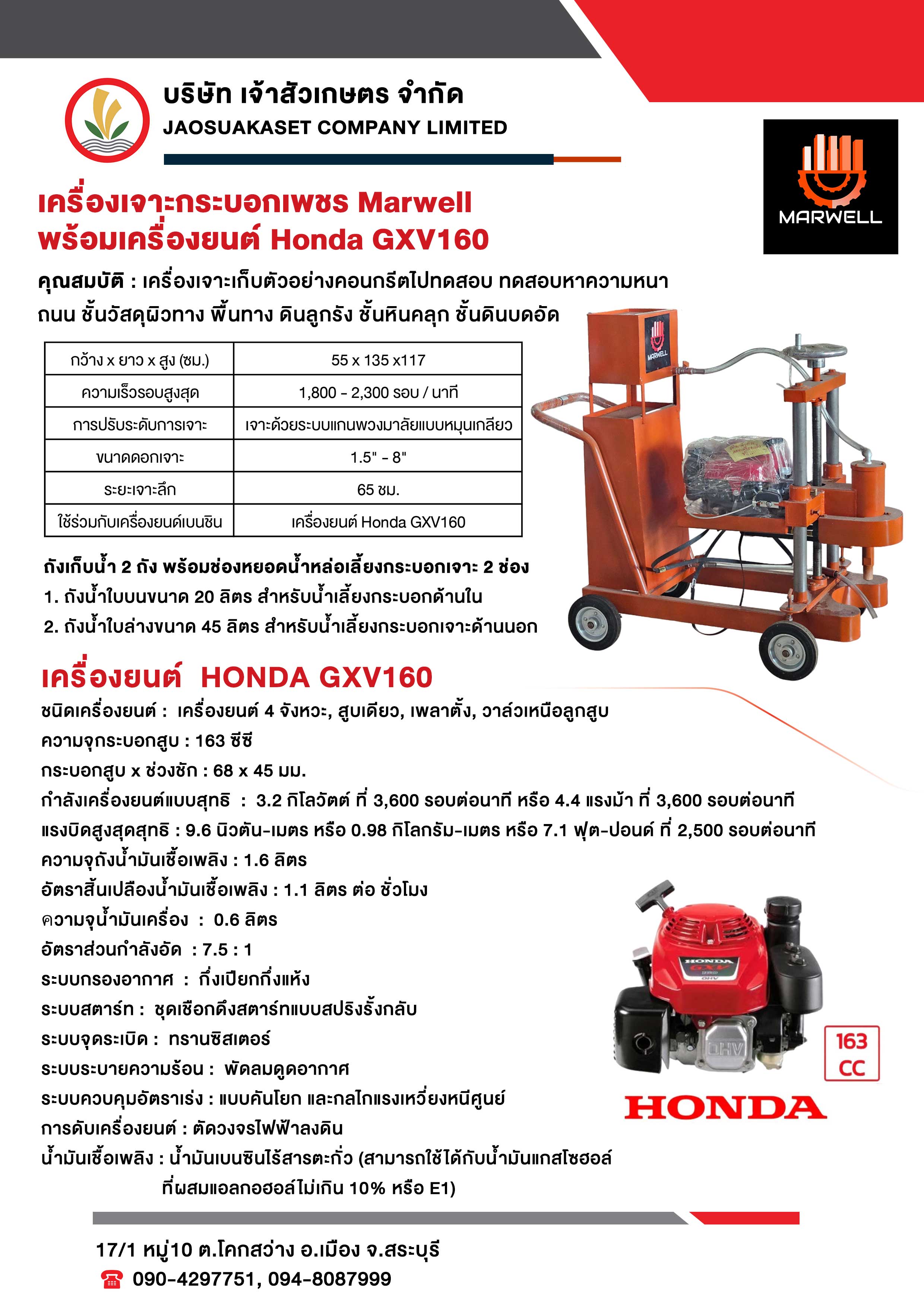 ❇️ รุ่น MWK-2 (ถังคู่) เครื่องเจาะกระบอกเพชร Marwell คุณสมบัติ : เครื่องเจาะเก็บตัวอย่างคอนกรีตไปทดสอบ ทดสอบหาความหนาถนน ชั้นวัสดุผิวทาง พื้นทาง ดินลูกรัง ชั้นหินคลุก ชั้นดินบดอัด กว้าง x ยาว x สูง (ซม.) : 55 x 135 x117 ความเร็วรอบสูงสุด : 1,800 - 2,300 รอบ / นาที การปรับระดับการเจาะ : เจาะด้วยระบบแกนพวงมาลัยแบบหมุนเกลียว ขนาดดอกเจาะ 1.5" - 8" ระยะเจาะลึก : 65 ชม. ใช้ร่วมกับเครื่องยนด์เบนชิน : เครื่องยนต์ Honda GXV160 ----------------------------------- ถังเก็บน้ำ 2 ถัง พร้อมช่องหยอดน้ำหล่อเลี้ยงกระบอกเจาะ 2 ช่อง 1. ถังน้ำใบบนขนาด 20 ลิตร สำหรับน้ำเลี้ยงกระบอกด้านใน 2. ถังน้ำใบล่างขนาด 45 ลิตร สำหรับน้ำเลี้ยงกระบอกเจาะด้านนอก ----------------------------------- ❇️ รุ่น MWK-1 (ถังเดี่ยว) กว้าง x ยาว x สูง (ซม.) : 50 x 125 x 105 ความเร็วรอบสูงสุด : 1,800 - 2,300 รอบ / นาที การปรับระดับการเจาะ : เจาะด้วยระบบแกนพวงมาลัยแบบหมุนเกลียว ขนาดดอกเจาะ : 1.5" - 8" ระยะเจาะลึก : 65 ซม. ถังบรรจุน้ำ : 45 ลิตร