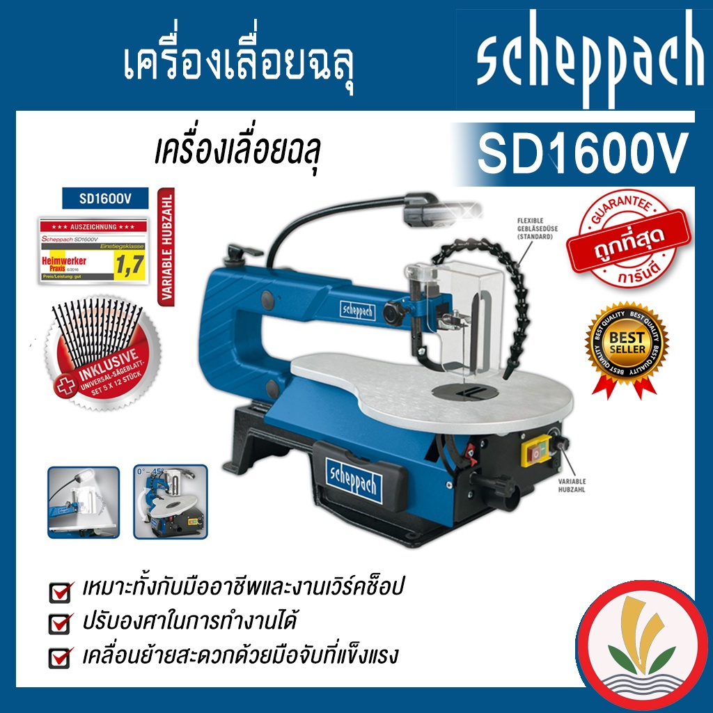 SCHEPPACH เครื่องเลื่อยฉลุ 16" 120W รุ่น SD1600V มาตรฐานเยอรมัน เป็นเครื่องมือที่เหมาะทั้งกับมืออาชีพและงานเวิร์คช็อป ด้วยคุณภาพสูงการสั่นสะเทือนต่ำและการใช้ฃานที่หลากหลายมาตรฐานเยอรมัน ปรับองศาในการทำงานได้ มอเตอร์กำลังแรง 120 วัตต์ ทำงานได้อย่างมีประสิทธิภาพ เคลื่อนย้ายสะดวกด้วยมือจับที่แข็งแรงสามารถปรับหน้าโต๊ะเพื่อการทำงานได้ถึง 45 องศา มีอุปกรณ์ป้องกันเพื่อความปลอดภัย