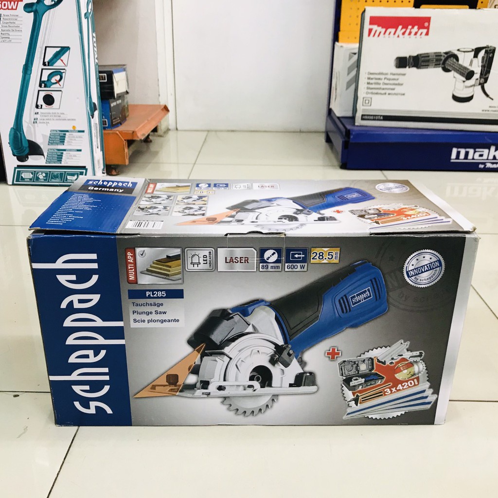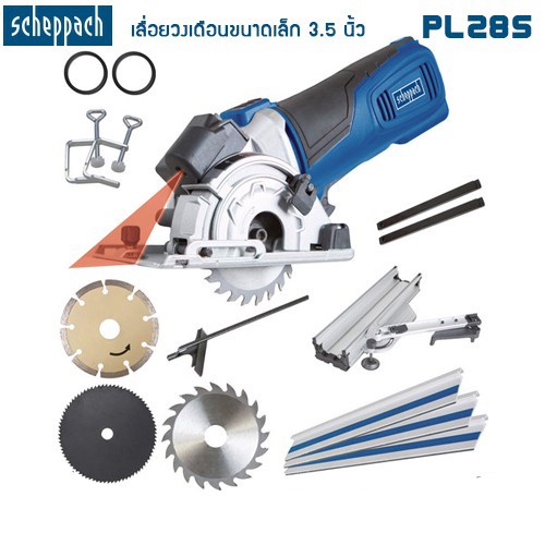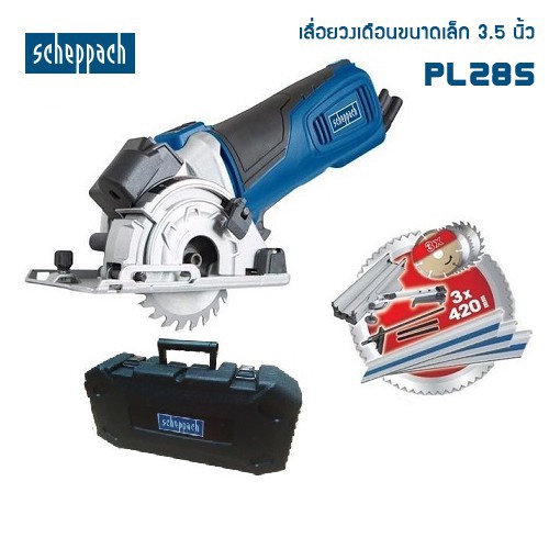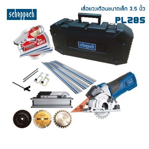 SCHEPPACH เลื่อยวงเดือนขนาดเล็ก 3.5 นิ้ว PL285 ของแท้ แถมรางตัดยาว 1.4 เมตร ภายในชุดมีรางแถมและใบตัดคอนกรีต,ใบตัดไม้,ใบตัดเหล็กบาง 3.5 นิ้ว