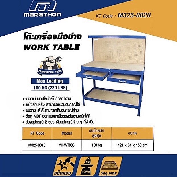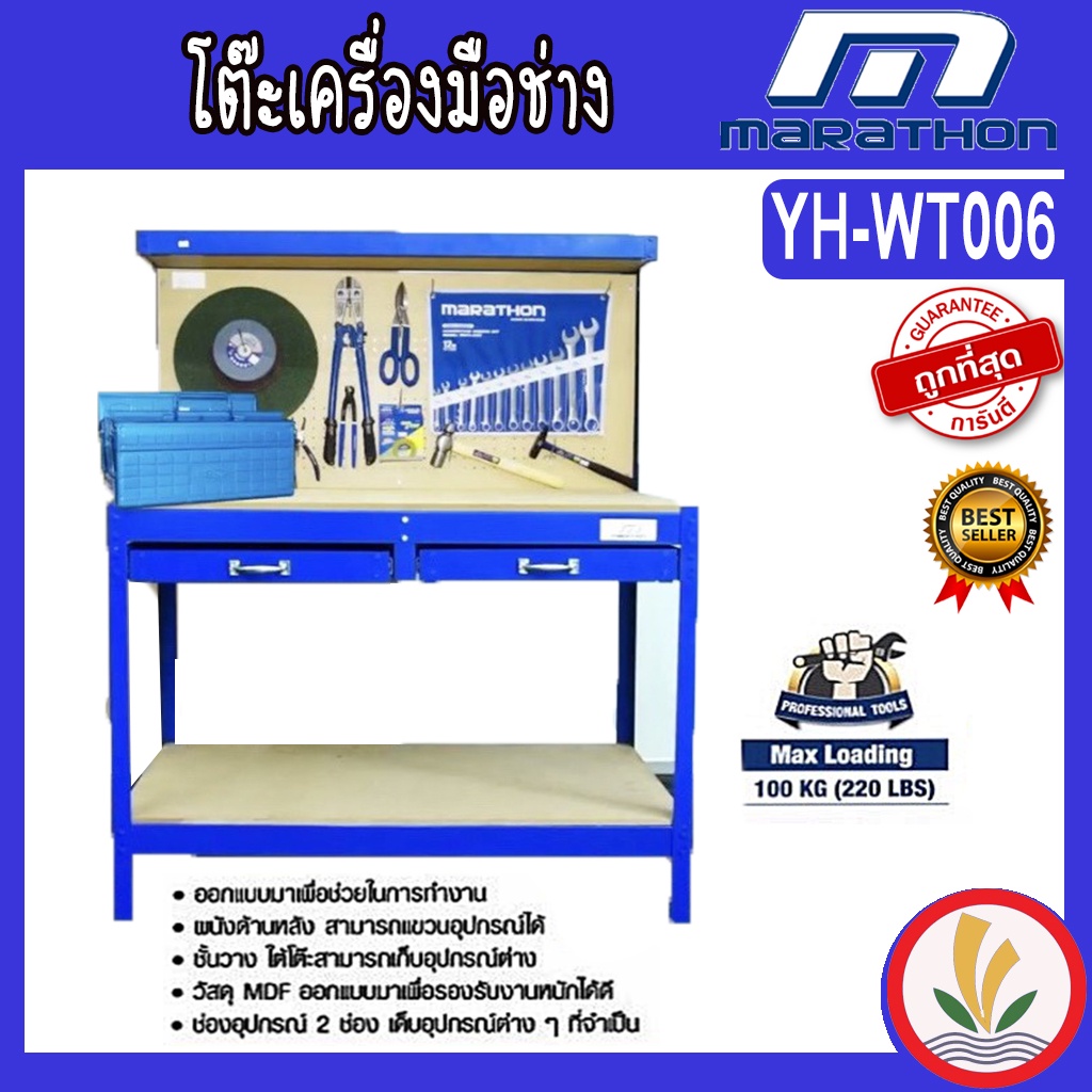 โต๊ะเครื่องมือช่าง MARATHON รุ่น YH-WT006 โต๊ะงานช่าง ออกแบบเพื่อใช้ในงานช่างโดยเฉพาะ ใช้ในงานช่างได้หลากหลาย ผนังด้านหลังมีรูสำหลับแขวนอุปกรณ์ได้ ชั้นใต้โต๊ะใช้เก็บของต่างๆ มีลิ้นชัก 2 ช่อง เหมาะสำหรับเก็บอุปกรณ์ที่จำเป็น โครงสร้างแข็งแรง ใช้งานหนักได้เลย