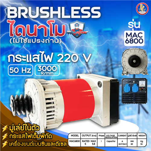 ไดนาโม ปั่นไฟ BRUSHLESS บัสเลส มิตซูแม็กซ์ MITSUMAX ไดนาโมเพลาลอย รุ่น MAC6800 5.8KVA และ MAC7800 6.8KVA