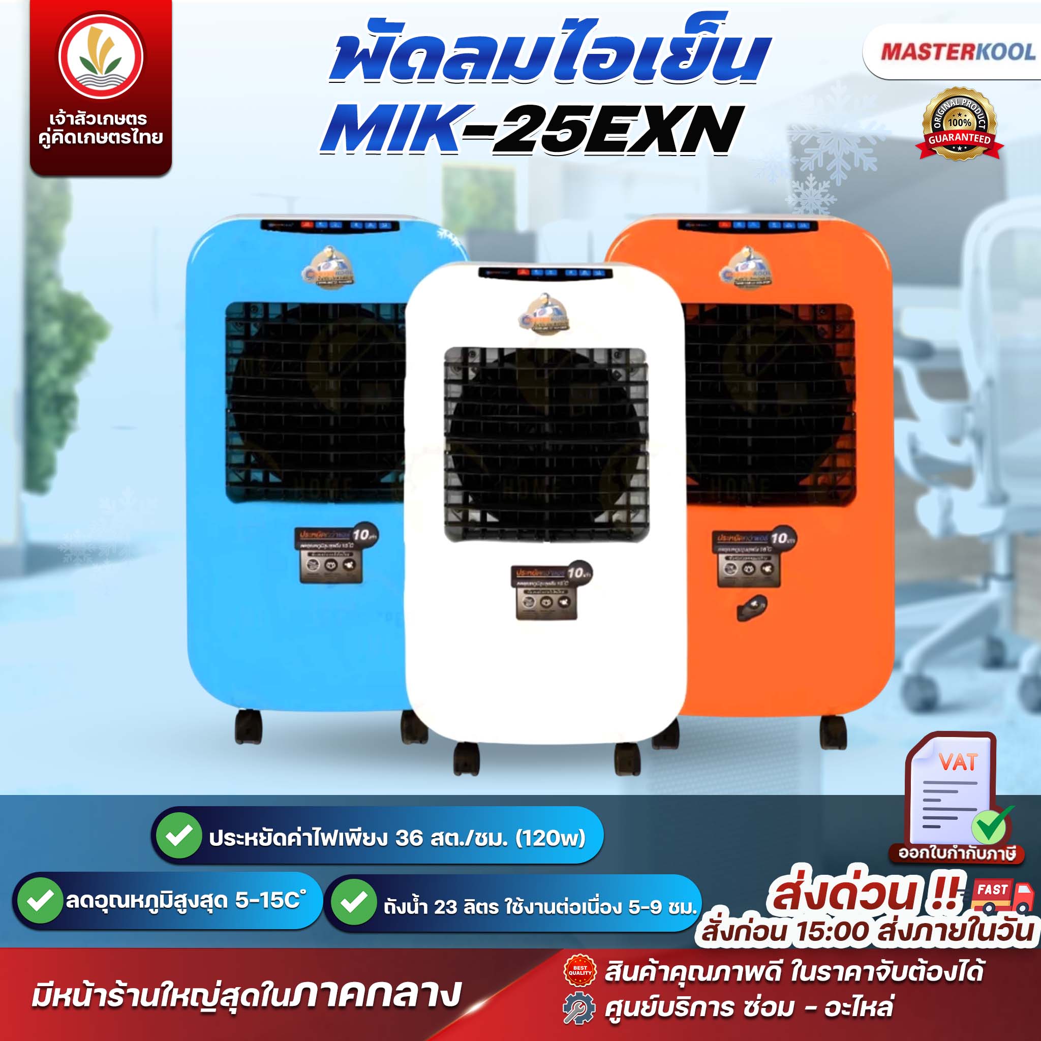 ***ออกใบกำกับภาษีรบกวนทักแชท*** สินค้าใหม่ ประกันอะไหล่ 1 ปี มอเตอร์ 3 ปี จากศูนย์มาสเตอร์คูล ตัวแทนจำหน่ายจาก MASTERKOOL พัดลมไอเย็น รุ่น MIK-25EXN พัดลมไอเย็น ราคาประหยัด กินไฟน้อย ดีไซน์สวยงามสดุดตา มี 3 สีให้เลือก กระทัดรัด เหมาะใช้งานในบ้าน ครอบคุมพื้นที่ 15-20 ตรม. มีแผนทำความเย็น 3 ด้าน เย็นกว่า 3 เท่า หน้าจอแสดงผลแบบ LED มีระบบ Ozone ฆ่าเชื้อโรคในน้ำ เพิ่มฟังก์ชั่นด้วยระบบควบคุมความชื้นอัตโนมัติ มีฟังก์ชั่นการทำงานด้วยระบบเปิด-ปิด อัตโนมัติ ควบคุมการทำงานด้วยรีโมทคอนโทล เคลื่อนย้ายสะดวกมีล้อเข็น มีระบบเตือนเมื่อน้ำหมดและตัดการทำงานของปั้มอัตโนมัติ คุณสมบัติสินค้า ลดอุณหภูมิ 5 - 15 องศา ประหยัดกว่าแอร์ 10 เท่า แข็งแรงทนทานด้วยวัสดุ ABS หน้าจอแสดงผลแบบ LED มีระบบควบคุมความชื้นอัตโนมัติ ปริมาณลมสูงแต่เสียงเบาด้วยใบพัดที่ออกแบบพิเศษ เย็นกว่าระบบทำความเย็นทั่วไป ด้วยการเพิ่มประสิทธิภาพแผ่นทำความเย็น 5090 3 ด้าน ขนาด 36 x 52 x 93 ซม ขนาดช่องลม35x35 ซม. ขนาดใบพัด 13 นิ้ว ครอบคลุมพื้นที่ 15-20 ตารางเมตร อัตราการใช้ไฟเพียง 42 สตางค์/ชั่วโมง กำลังไฟฟ้า 120 วัตต์ แหล่งจ่ายไฟฟ้า 220 v/50Hz เติมน้ำ 23 ลิตร ใช้งานต่อเนื่อง 5 - 9 ชั่วโมง น้ำหนักสุทธิ(ก่อนเติมน้ำ) 13 กิโลกรัม น้ำหนักขณะทำงาน 36 กิโลกรัม อัตราการใช้น้ำ 2.8 - 4.8 ลิตร/ชั่วโมง ระดับเสียง 52 เดซิเบล ลดอุณหภูมิได้สูงสุดถึง 5-15 องศา มีรีโมทคอนโทรลและตั้งเวลาปิดอัตโนมัติ พร้อมระบบโอโซนฆ่าเชื่อโรคในน้ำ ระบบเตือนและตัดปั้มเมื่อน้ำหมด