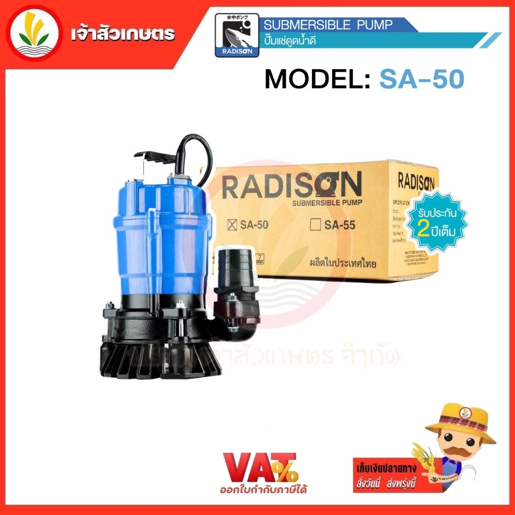 - ปั๊มน้ำรุ่น SA-50 เป็นปั๊มแช่ดูดน้ำดี น้ำสะอาด น้ำฝน น้ำท่วมขัง (ไม่เหมาะกับน้ำสกปรก มีทราย โคลน และสิ่งปฏิกูล) มีน้ำหนักเบา เคลื่อนย้ายสะดวกง่ายต่อการใช้งาน เหมาะสำหรับอุตสาหกรรม สถานที่ก่อสร้าง และการเกษตร