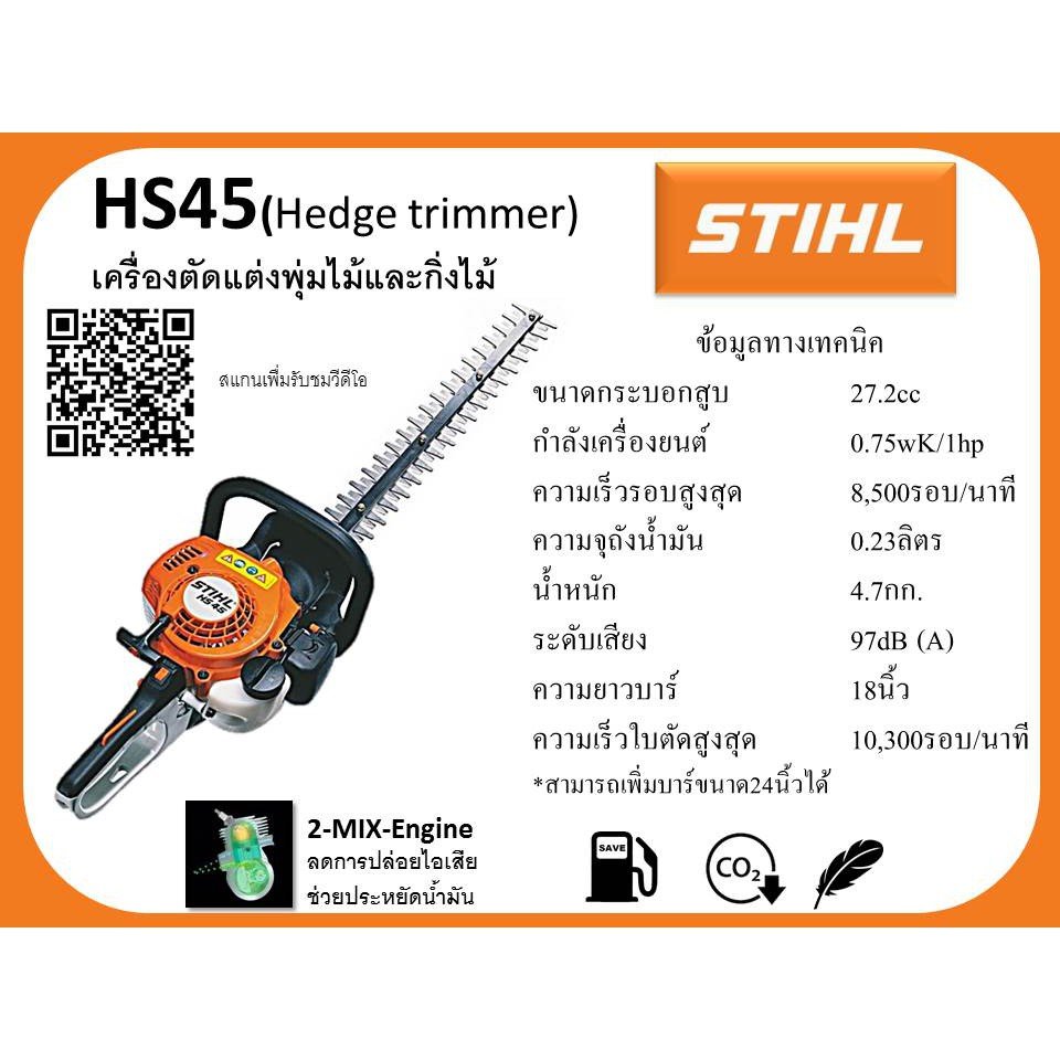 เครื่องตัดแต่งพุ่มไม้และกิ่งไม้ STIHL HS45 ข้อมูลทางเทคนิค - ขนาดกระบอกสูบ 27.2cc - กำลังเครื่องยนต์ 0.75wK/1hp - ความเร็วรอบสูงสุด 8,500 รอบต่อนาที - ความจุถังน้ำมัน 0.23ลิตร - น้ำหนัก 4.7กก. - ระดับเสียง 97dB(A) - ความยาวบาร์ 18นิ้ว - ความเร็วใบตัดสูงสุด 10,300 รอบต่อนาที *สามารถเพิ่มบาร์ขนาด 24นิ้วได้