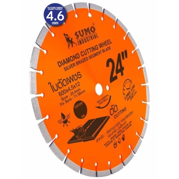 ใบตัดเพรช Sumo รหัสรุ่น 22412 สำหรับผ่าร่อง ตัดถนน ตัวใบและฟันยึดติดกันด้วยลวดเชื่อมเกรดดีที่สุดจึงทำให้ใบตัดมีความแข็งแรง ทนทาน ใช้ได้นาน ตัดถนนได้มากกว่า 200เมตร ใช้ได้ทั้งเปียกและแห้ง