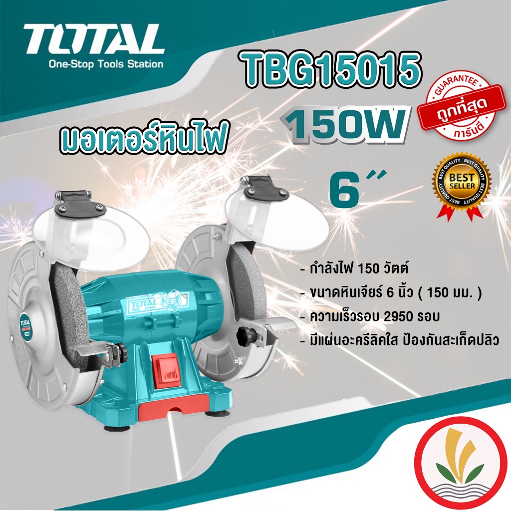 Total มอเตอร์หินไฟ 6 นิ้ว 150 วัตต์ พร้อม หินเจียร์ 2 ก้อน รุ่น TBG15015 - สินค้าใหม่ 100% - กำลังไฟ 150 วัตต์ - ขนาดหินเจียร์ 6 นิ้ว ( 150 มม. ) - ความเร็วรอบ 2950 รอบ - มีแผ่นอะครีลิคใส ป้องกันเศษฝุ่น หรือสะเก็ดปลิว